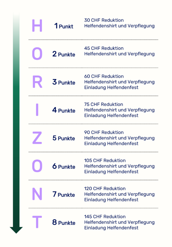 Alle Helfendenschichten findest du mit Aufgabenbeschreibungen auf unserem Helfendentool. Dort siehst du auch, wie viele Punkte du pro Einsatz erhältst. Je mehr Punkte du sammelst, desto mehr Goodies erwarten dich!